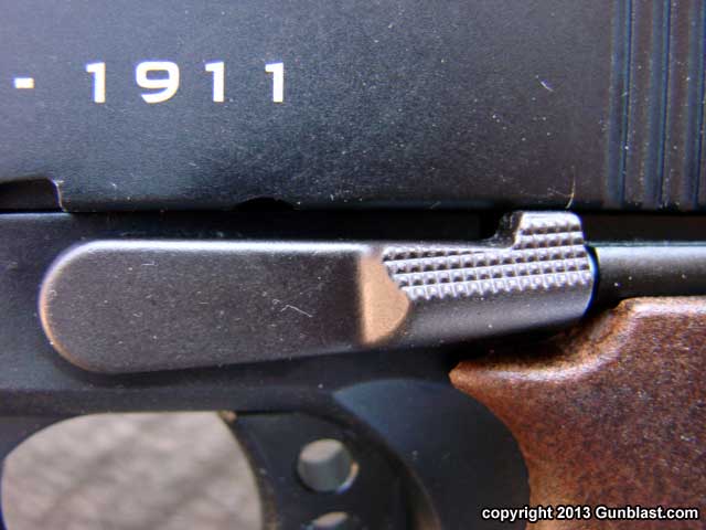 a centerfire 1911, but it is contained by a slide stop and an