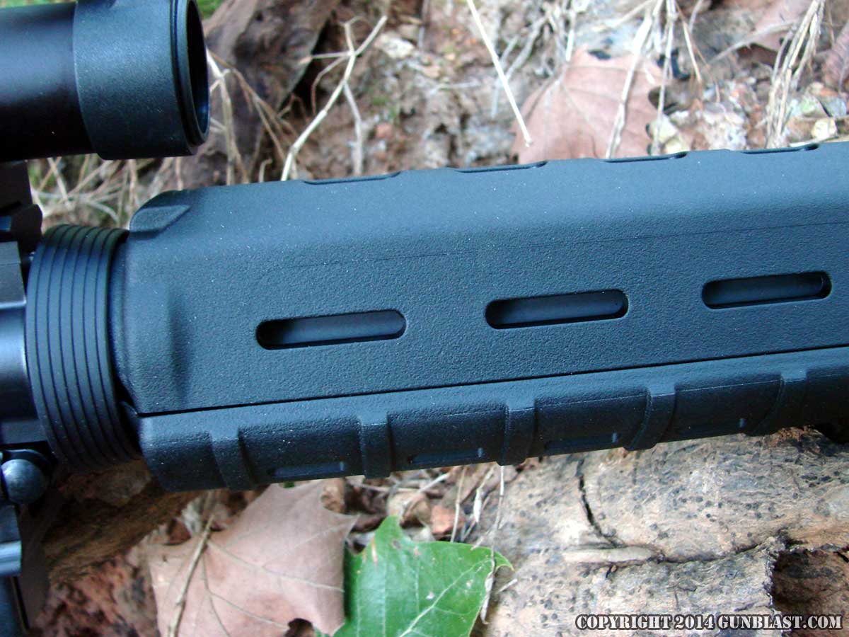 of the gas block. The handguard is a black synthetic Magpul MOE