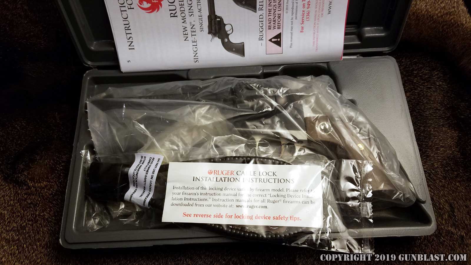 a standard gray plastic Ruger box, along with a black