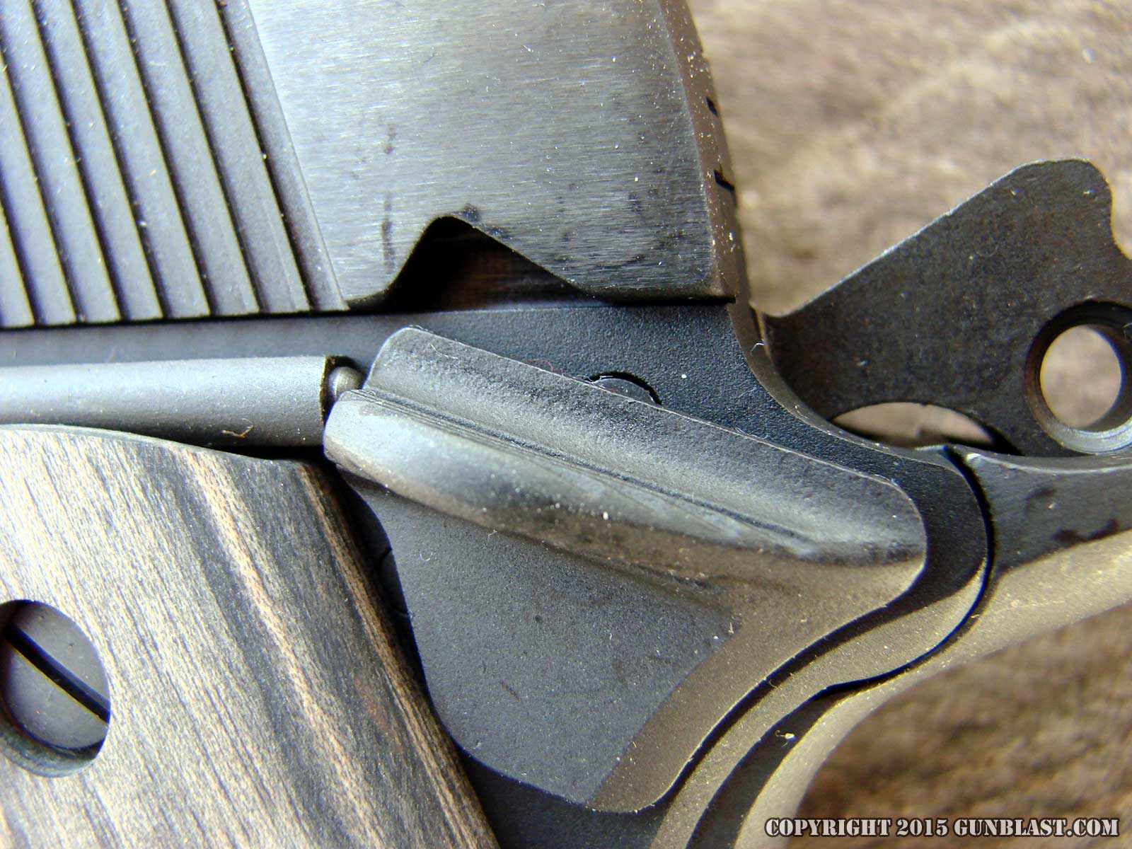 Slide lock (top), manual safety (center), magazine release (bottom).