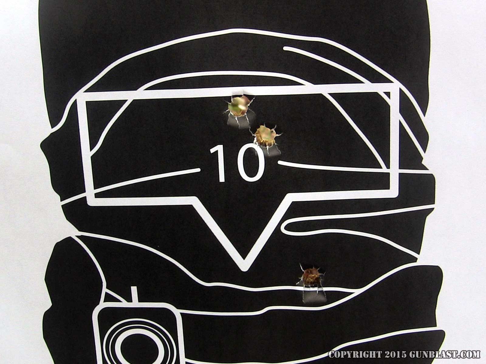 Combat accuracy: groups fired offhand at seven yards. Target from Trigger Happy Target Co.