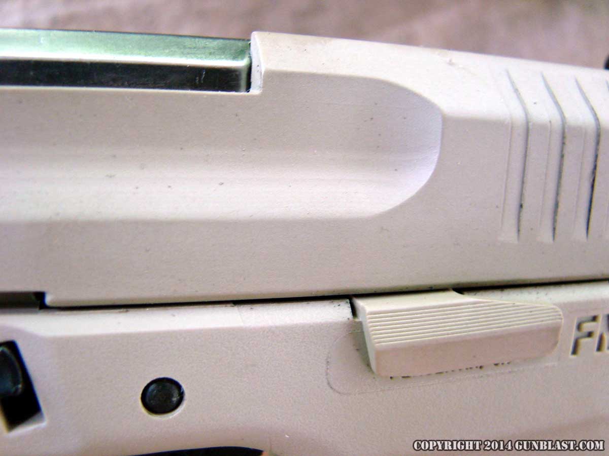 across the grip frame, and includes the slide lock.