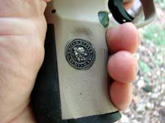 Inset on each side of the polymer grip is a