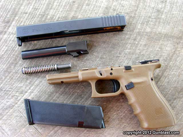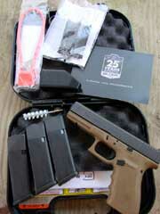 The Gen4 Dark Earth Model 21 comes with hard case, cable lock, extra backstraps, pin punch, cleaning brush, three magazines, mag loading tool, and instructions.