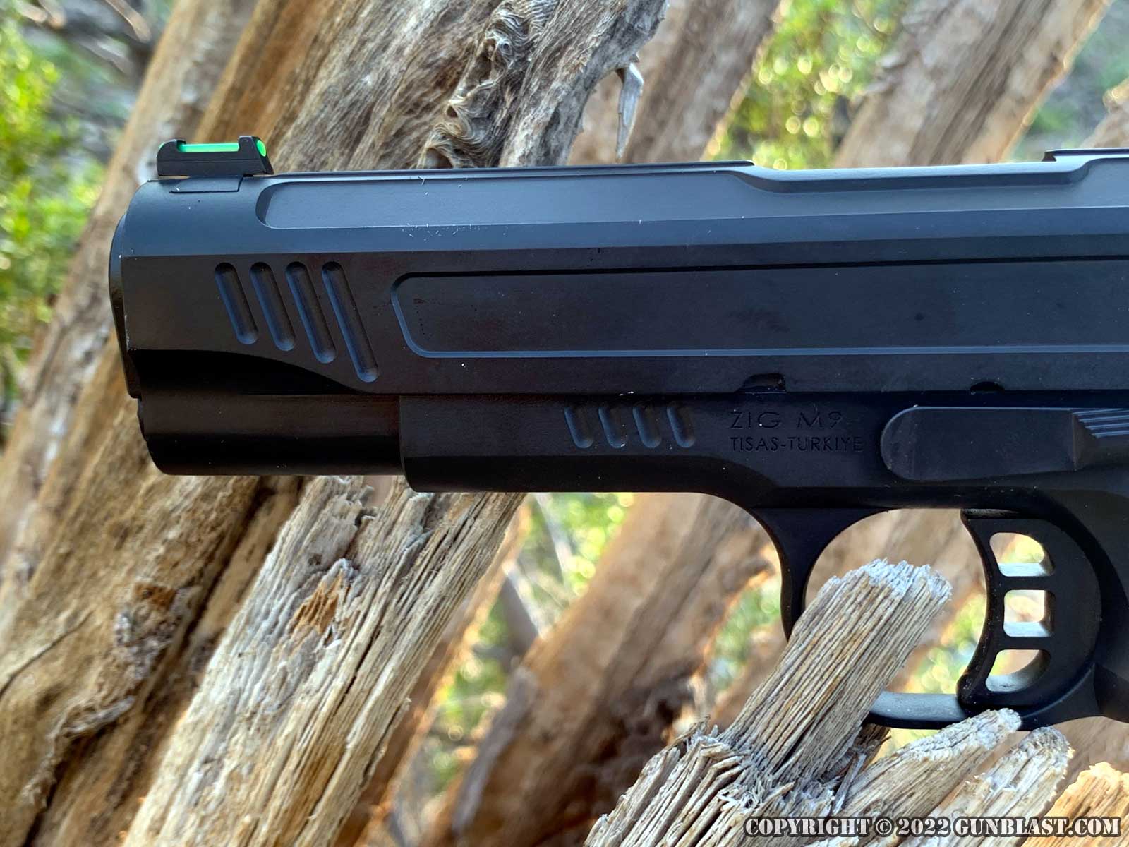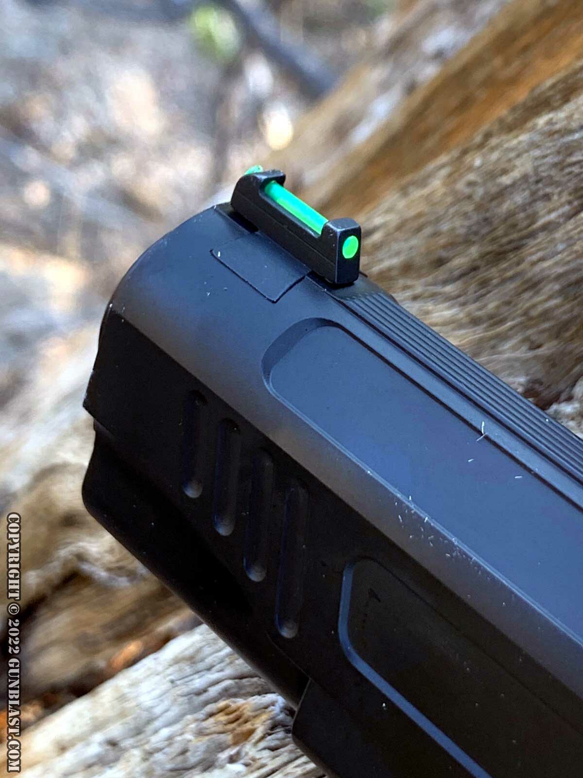 The ejection port is flared and lowered. It has a green fiber-optic front sight and a U-notch rear