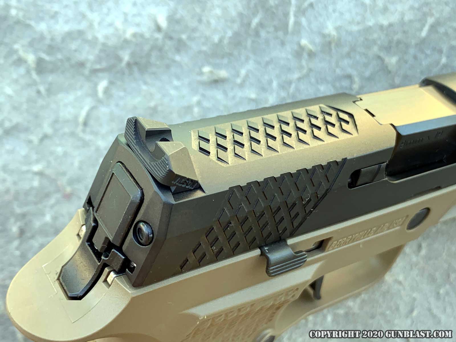 texture with front a rear cocking serrations, slide top