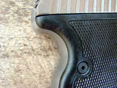 frame, partially covered by the right grip panel. The sights are