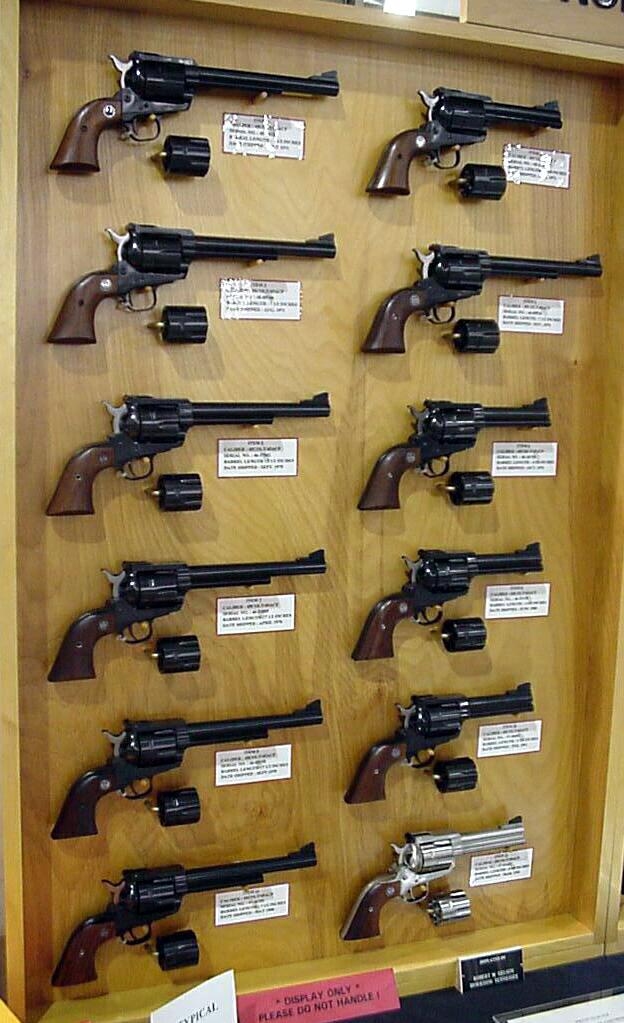 A mind-boggling array of every kind of Ruger Blackhawk Convertibles imaginable - the term "convertible" refers to revolvers that are made to fire two different cartridges from the same gun by swapping cylinders, as in .38 Special - .357 Magnum / 9mm Parabellum or .45 Colt / .45 ACP.