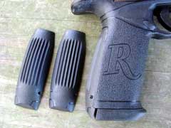 interchangeable inserts at the rear of the grip. The magazine