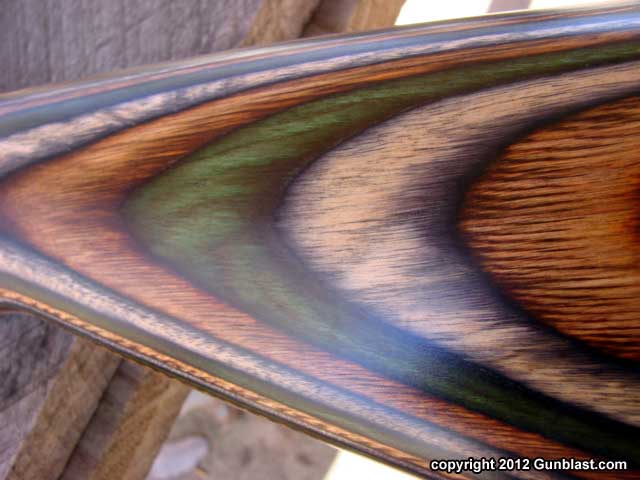 The laminated wood stock has a green, brown,