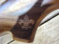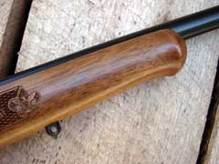 The walnut stock is laser-engraved with Boy Scout and Ruger