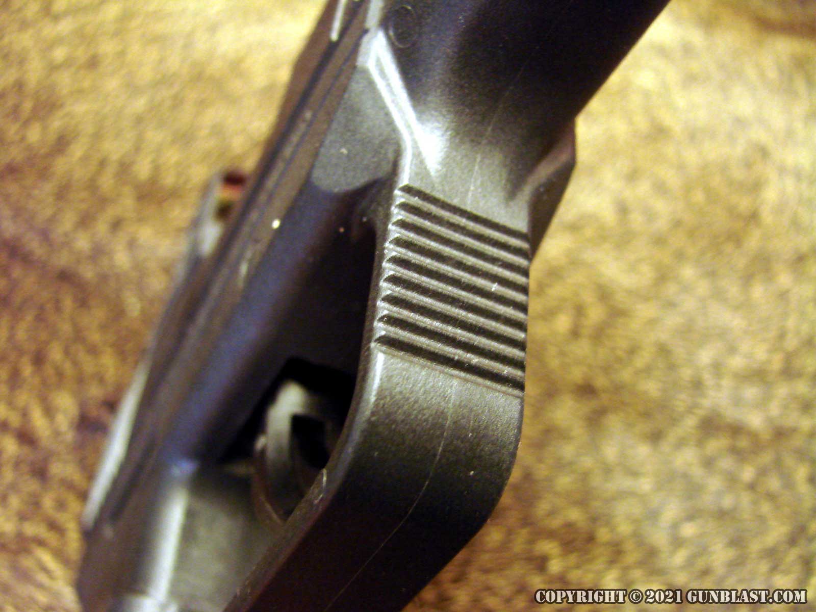 Trigger guard is serrated for "finger-forward" grip.
