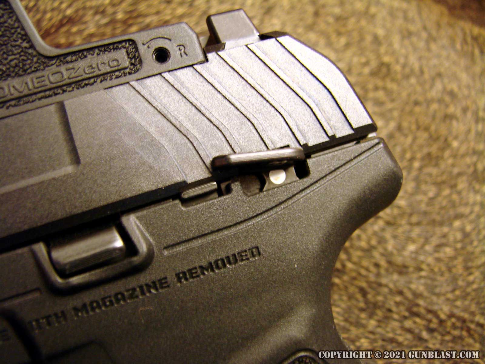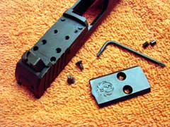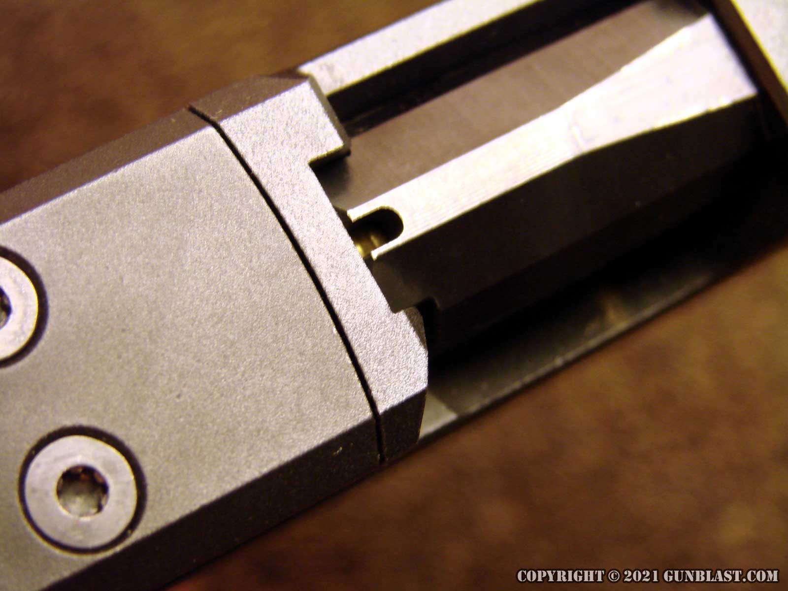 The MAX-9's slide features a removable plate, covering pre-drilled holes to fit a number of optical sights.