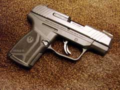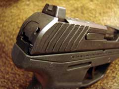 As can be readily seen, there is no practical size difference between the Kahr and the MAX-9. The Kahr is 2.5 ounces lighter than the MAX-9, but that difference cannot be readily discerned by my hand. The Kahr is 0.39 inches shorter than the MAX-9, but the balance of the Kahr is slightly forward from that of the MAX-9, making the Kahr feel slightly more muzzle-heavy than the MAX-9. The difference is negligible, but it is there, and to my hand it favors the MAX-9. The MAX-9 is constructed with the familiar Ruger toughness and durability. The slide is made from through-hardened alloy steel, finished in black oxide, and the barrel is similarly black oxide finished alloy steel. Firing +P and +P+ ammunition proved to be no problem for the MAX-9 (PLEASE NOTE: Ruger advises against a steady diet of +P ammunition in the MAX-9, and that one should never use +P+), and all loads tried functioned 100%, with no failures of any kind noted; this level of reliability is the most crucial aspect of a firearm upon which one bets one's life. The grip frame is high performance glass-filled nylon, and is medium-textured for a secure and comfortable hold. I found the grip texture to be just right, with an aggressive-enough texture to aid in the only type of "gun control" which should be discussed, while not so aggressively-textured that the hand is abraded under recoil, or concealment becomes a problem. The MAX-9's trigger is excellent, incorporating an articulated safety lever in the center. After just under one-quarter inch of lighter takeup, the trigger travels another one-quarter inch before breaking cleanly and consistently at 3 pounds, 2.3 ounces for an average of five pulls, as measured by my Lyman Electronic Digital Trigger Pull Gauge. Not only is trigger travel short and trigger pull pleasantly light, the pull is very smooth and even, yielding a much better pull than one would expect from a factory trigger. Also, the trigger resets after only about 3/8" of slide travel. Very nicely done, Ruger! The safety features of the striker-fired MAX-9 are several. As mentioned above, the trigger incorporates an articulated safety lever, which will be familiar to those who are accustomed to striker-fired pistols, and is automatic in operation. Internally, the MAX-9 incorporates a striker blocker. Externally, there is a manual safety that will be intuitive in operation for those who are familiar with the safety of the venerable 1911 pistol: the safety lever naturally and comfortably falls under the shooter's thumb on the port side of the pistol (the lever is not ambidextrous), and operates by sweeping UP for Safe, and DOWN for Fire. The safety lever is easy to operate with the right thumb, and clicks positively into each position. Finally, the top of the barrel hood has a witness hole which serves as a loaded-chamber indicator. None of these reduce the importance of a firearm's primary safety, which is located between the shooter's ears, but the MAX-9 is a very safe design that should prove to be proof against anything but fools. The sights on the MAX-9 are a cut above what one would expect in a pistol of the MAX-9's price range. The rear sight is thankfully steel, dovetailed into the slide and drift-adjustable for windage, with a medium-high profile and a vertical front face which would aid in racking the slide against a table or corner, should it become necessary. The front sight is excellent, featuring a combination Tritium / Fiber Optic bead that makes the sight picture very easy to acquire in both bright and low-light conditions. The Bad Guys often come out at night, and such a front sight can be very important to keeping Mom's favorite boy, or those he loves, out of harm's way. If you have ever shopped for Tritium night sights, then you know how much value is added by Ruger's inclusion of such a sight into the very reasonable price of the MAX-9. As optical sights have become smaller and more reliable, and the prices of them have begun to decrease, they have recently become very popular on semi-auto pistols. In fact, a mini-industry has formed to convert pistols to their use, along with a proliferation of brands and styles from which to choose. With the availability of different styles, sizes, and price points, it has actually become practical to use such sights on a defensive pistol. The top of the MAX-9's slide features a removable plate, with mounting holes pre-configured underneath to accommodate a wide variety of these optical sights. I know of fifteen different currently-available optical sights that will bolt right up to the MAX-9, and there will undoubtedly be more as their popularity increases and their mounting systems become more universal; the spec chart below contains a list of these currently-available options. While not really practical (yet!) for my preferred pocket carry method, optical sights are a viable option for belt carry without adversely affecting the ability to conceal the pistol. Also, with an optical sight installed, the MAX-9 could very well be pressed into service on the target range. You may smirk at my suggestion that the MAX-9 could do Yeoman's Duty as a target pistol, but hear me out: the MAX-9 is inherently no less accurate than its larger siblings, with the major difference relating to accuracy being the short sight radius (the distance between the front and rear sights) dictated by the pistol's smaller size. As a rule, the shorter the sight radius, the greater the potential geometrical error imposed by the shooter's natural "sight wobble"; this is why shorter-barreled firearms are considered to be less accurate than their longer-barreled siblings, not because of any inherent inaccuracy related to barrel length. With an optical sight installed, this limitation is eliminated; no longer is there a sight radius with which to contend, but there is only one sight plane, and nothing has to be lined up by the eye. This can aid in both precision and speed, and Ruger has us covered 