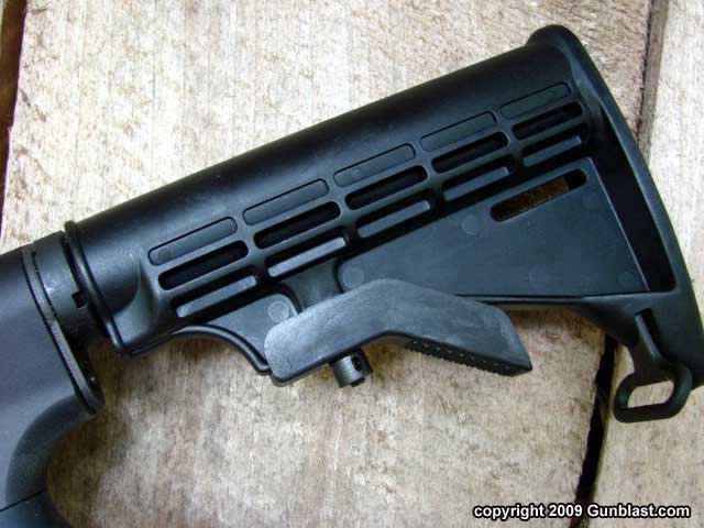 comfortable AR-style pistol grip. Between the pistol grip and
